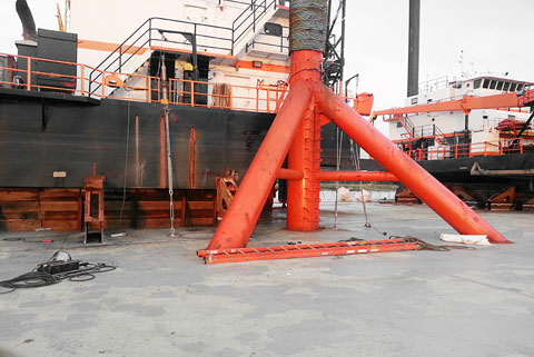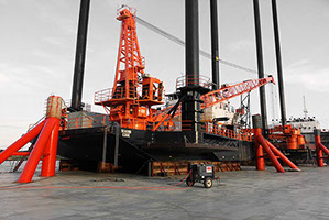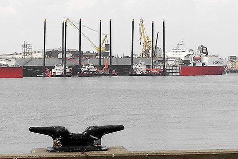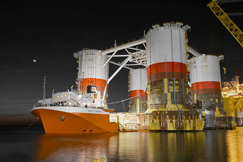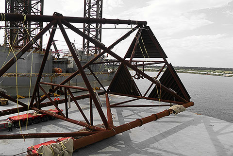 Sea fastening operations on three lift boats in Pascagoula in preparation for shipment to West Africa on board the M/V Triumph